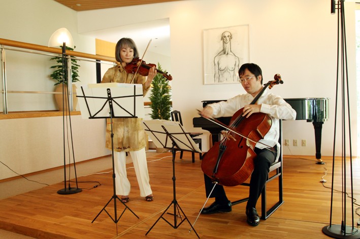 今年の演奏者は、山本裕子(ピアノ)、長明康郎(チェロ)、渡邊篤子(ヴァイオリン)、松浦 麗(メゾソプラノ)の諸氏。長明さんはセザミの会員には既にお馴染みの、東京シティフィルのチェロ・トップ奏者、渡邊篤子さんは矢崎さんの奥様で、現在はフランス国立フレンヌコンセルヴァトワール、他の教授をされています。